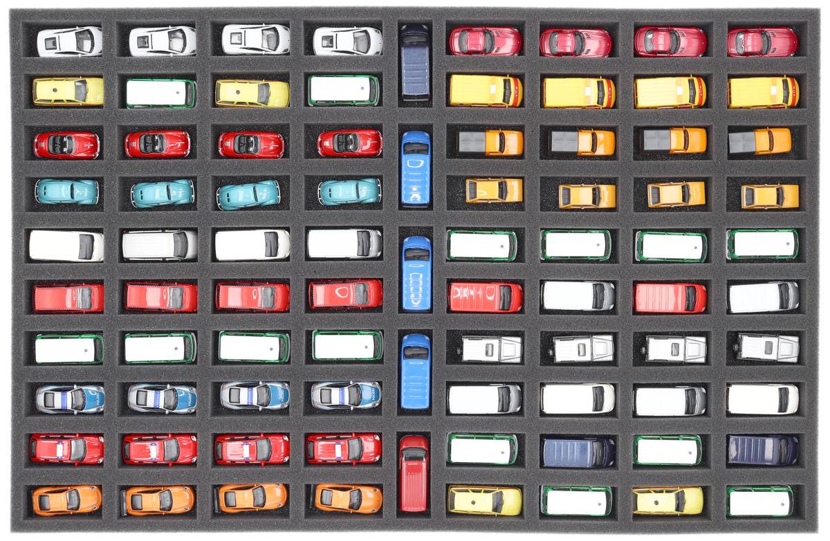 Qu'il s'agisse d'un rangement sûr sur l'étagère ou d'un transport vers le prochain salon - avec cet insert en mousse de Feldherr, vos modèles réduits à l'échelle 1:87 sont protégés de manière fiable. Les 85 compartiments s'adaptent parfaitement aux véhicules et les protègent des rayures, de l'abrasion de la peinture et des dommages causés par le glissement.