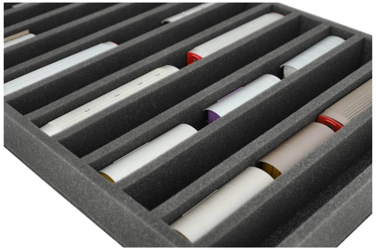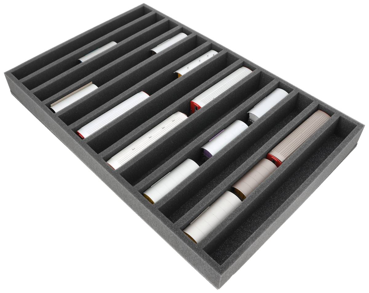 Une protection sûre pour vos maquettes de trains à l'échelle H0m : L'insert en mousse Feldherr avec 13 compartiments permet de garder les locomotives et les wagons en position verticale en sécurité et à portée de main - idéal pour le transport ou le stockage à l'abri de la poussière dans des Euroboxes de 60 x 40 cm.