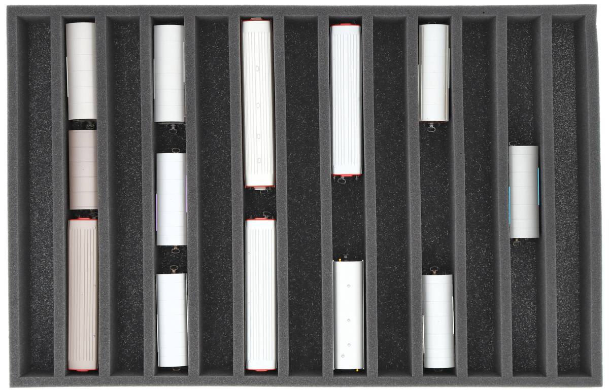Que ce soit pour le transport lors d'expositions, de réunions de modules ou pour un rangement sûr sur des étagères à la maison, cet insert protège vos locomotives et wagons à l'échelle H0m de manière fiable. Les 13 compartiments maintiennent les modèles debout et les protègent des chocs et des rayures.